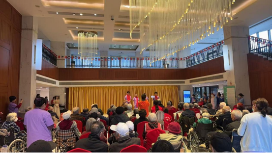 活动当日,颐养中心大厅暖意融融:轮椅与软垫座椅错落有致,手持节目单的长者们笑意盈盈。志愿者们早早到场,或搀扶行动不便的老人入座,或协助工作人员调试音响设备,红色志愿服的身影穿梭其间,成了厅内最鲜亮的色彩。