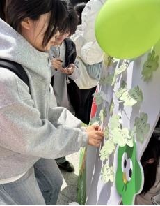 一旁的心愿墙上,挂满了绿色的便签,上面写着一个个真诚的故事——有对新学期的期许,有对过去的告别,有生活中的小确幸,也有藏在心底的烦恼与困惑。芬芳馥郁的花束与字迹工整的便签相映成趣,构成了春日校园里一道温柔而治愈的风景线。